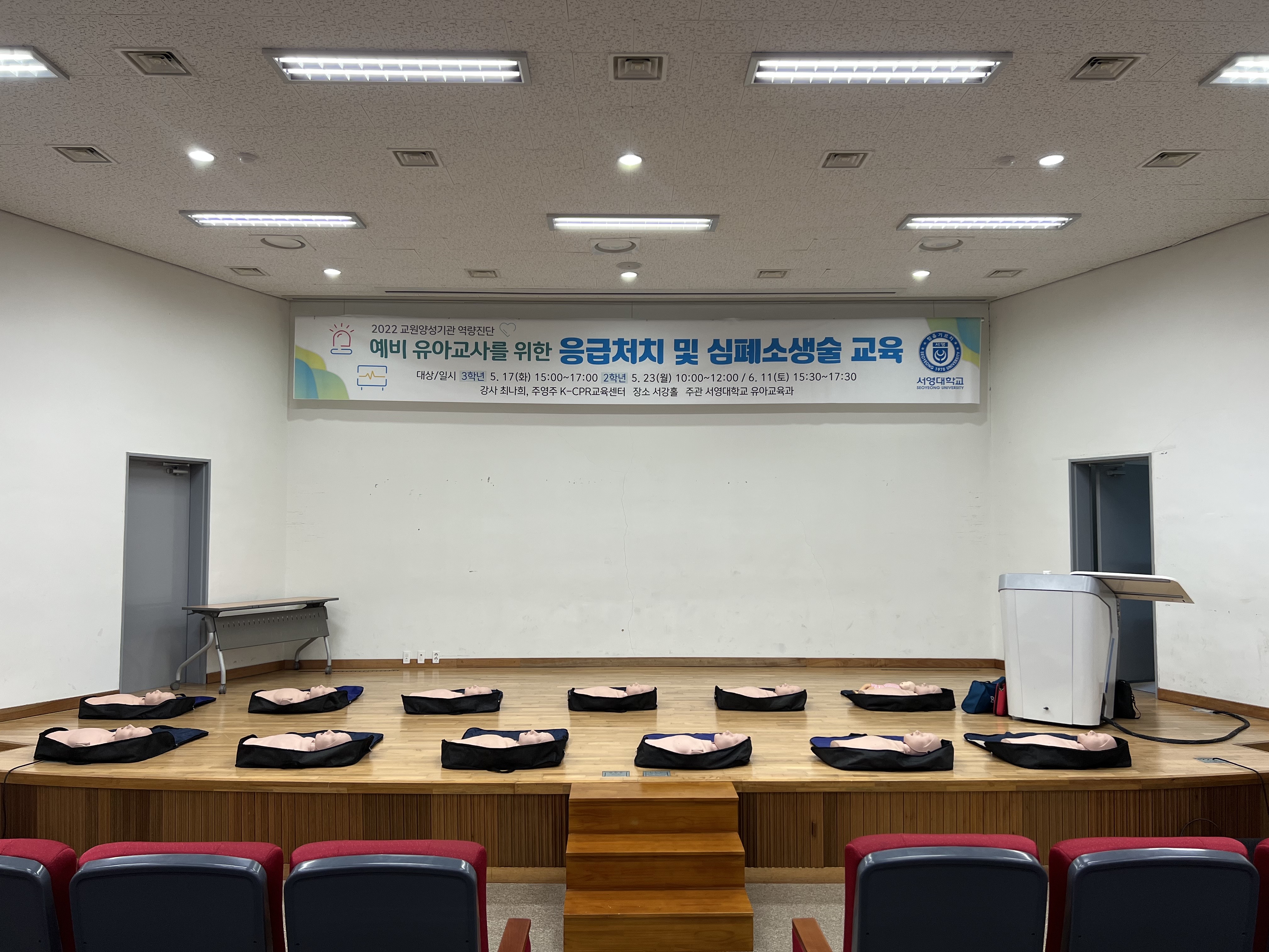 응급처치 및 심폐소생술 교육 - 일시 : 2022년 5월 17일 (화) - 강사 : 주영주 강사님 - 대상 : 유아교육과 3학년 - 장소 : 서강홀