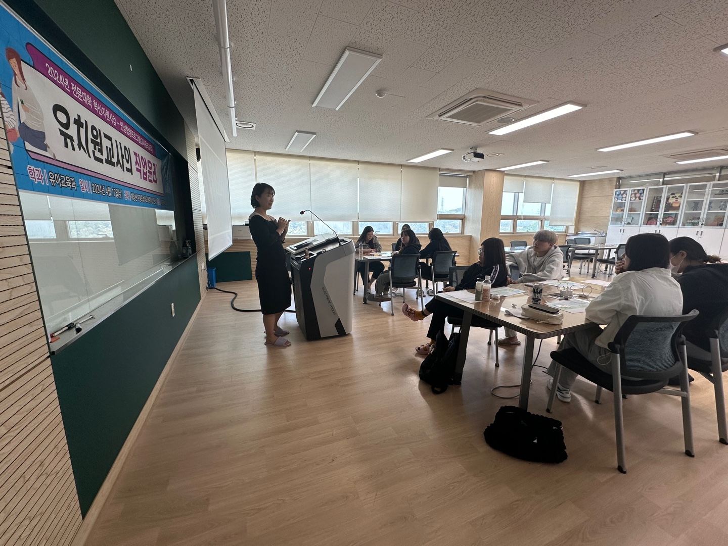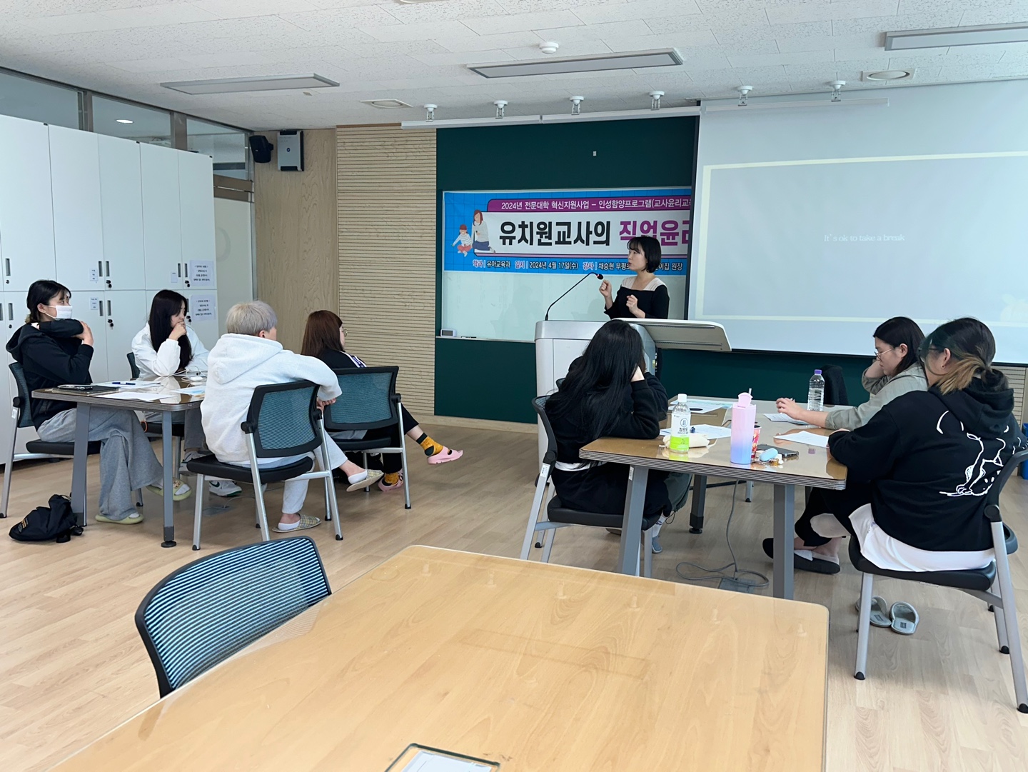 유치원교사의 직업윤리- 일시 : 2024년 4월 17일- 강사 : 채승현 원장님- 대상 : 유아교육과 2학년- 장소 : 서강관 403호- 내용 : 교사와 영유아교사란 무엇인가와 교육윤리, 윤리강령에 대한 정의에 대하여 배우고 윤리적 딜레마에 사례들을 통해 토론하는 시간을 가지게 되었습니다.