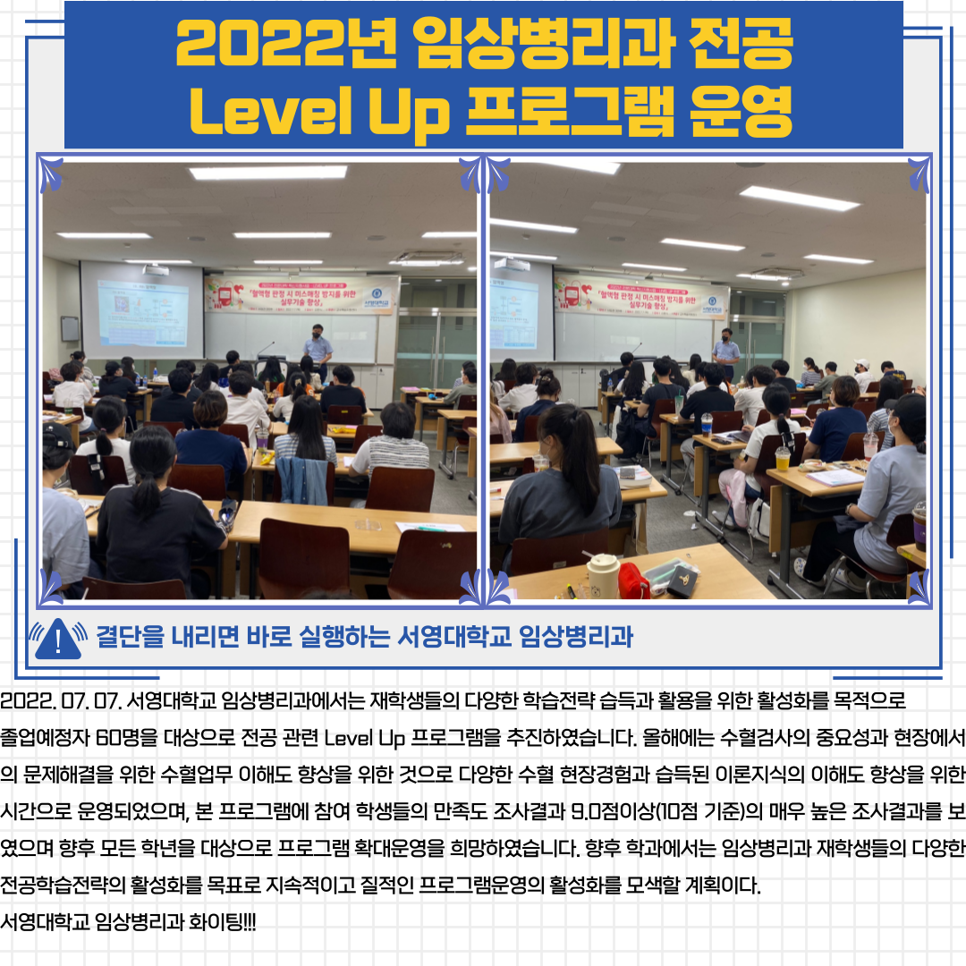2022. 07. 07. 서영대학교 임상병리과에서는 재학생들의 다양한 학습전략 습득과 활용을 위한 활성화를 목적으로 졸업예정자 60명을 대상으로 전공 관련 Level Up 프로그램을 추진하였습니다. 올해에는 수혈검사의 중요성과 현장에서의 문제해결을 위한 수혈업무 이해도 향상을 위한 것으로 다양한 수혈 현장경험과 습득된 이론지식의 이해도 향상을 위한 시간으로 운영되었으며, 본 프로그램에 참여 학생들의 만족도 조사결과 9.0점이상(10점 기준)의 매우 높은 조사결과를 보였으며 향후 모든 학년을 대상으로 프로그램 확대운영을 희망하였습니다. 향후 학과에서는 임상병리과 재학생들의 다양한 전공학습전략의 활성화를 목표로 지속적이고 질적인 프로그램운영의 활성화를 모색할 계획이다. 서영대학교 임상병리과 화이팅!!!