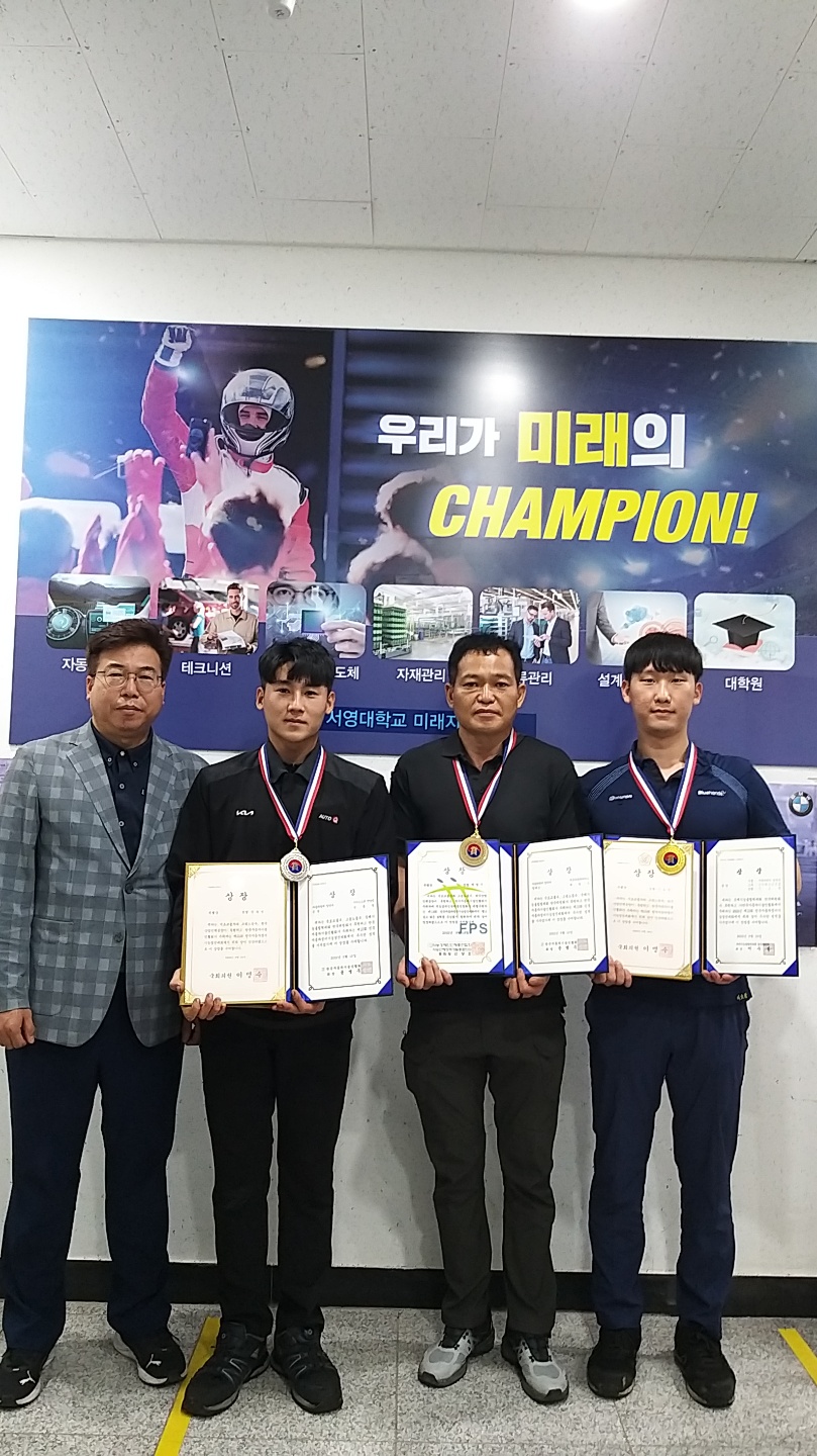 킨텍스에서 성황리 진행된 자동차정비인들의 축제로써 프로페셜한 정비기능을 겨루는 "제13회 전국자동차정비기능경진대회"가 9월 17일 ~18일 시행되었습니다. 많은 훈련과 노력을 통해 우리 대학 미래자동차과 산업체 재학생들이 출전해 우수한 성과를 거두어 미래자동차과를 빛내게 되었습니다. 장려상(2학년 박*우), 은상(3학년 김*영), 금상(3학년 이*한)  수상의 쾌거를 거두었습니다. 금상을 수상한 이*한 학생은 특별상(국회의원상)까지 받는 쾌거를 얻었으며 "이번 입상에 만족하지 않고 더욱 발전하고 성장하는 테크니션이 되고 싶다. 그리고, 미래자동차공학과 지도 교수님들과 P.T.C 서영 프로페셔널 테크니션 클럽 팀원들께도 감사하다"는 인사를 전했습니다.