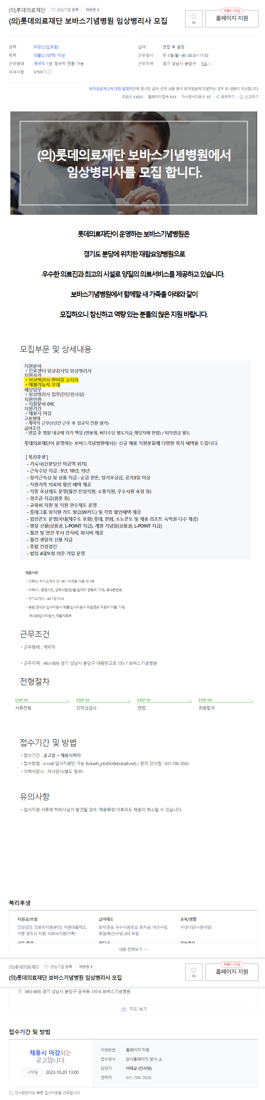 입사 지원: [(의)롯데의료재단] (의)롯데의료재단 보바스기념병원 임상병리사 모집 (채용시 마감) - 사람인 (saramin.co.kr)