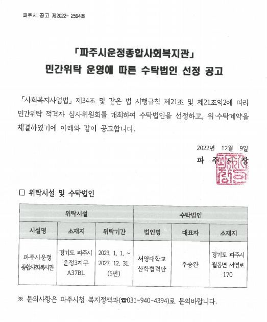 2022년 서영대학교 _ 「파주시운정종합사회복지관」 민간위탁 운영에 따른 수탁법인 선정
