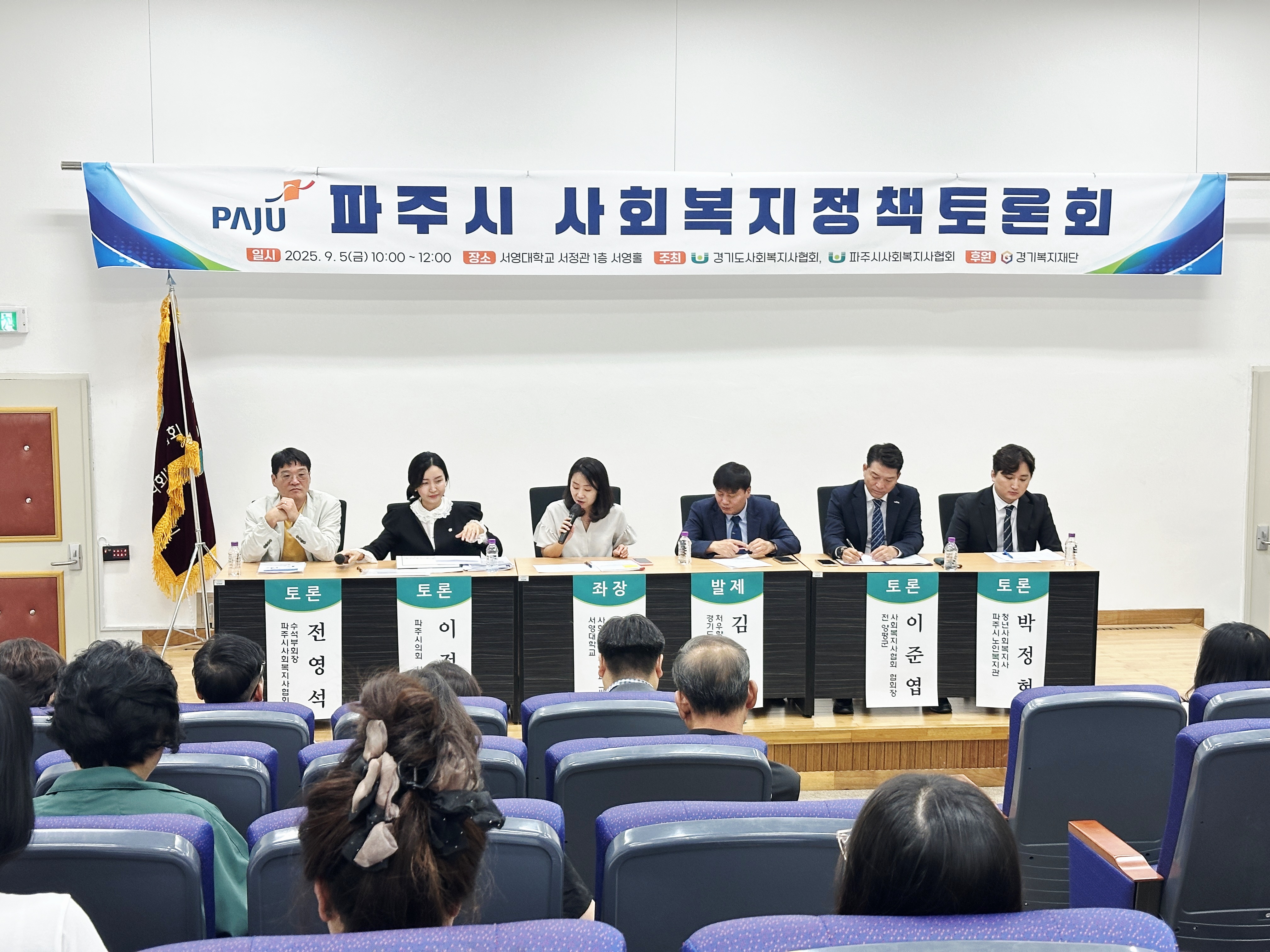 지난 9월5일(금) 서영대학교 서영홀에서 ‘파주시 사회복지사 등의 처우개선을 위한 제언’ 이라는 주제로 파주시 사회복지정책토론회가 개최되었다. 이번 토론회는 사회복지사의 처우 개선과 제도적 지원 확대를 주제로, 현장의 목소리를 정책에 반영하고 지역 실정에 맞는 맞춤형 방안을 모색하기 위해 마련됐으며, 경기도사회복지사협회장, 파주시사회복지협회장, 파주시 복지정책과를 비롯한 관계 기관 및 단체 관계자 70여 명이 참석한 가운데 진행됐다. 경기도사회복지사협회 처우향상위원장인 김도묵이사장의 발제에 이어 사회복지행정과 김효선학과장이 좌장으로 토론회를 진행하였으며, 박정현 청년사회복지사, 이준엽 전 양평군사회복지사협회협회장, 전영석 파주시사회복지사협회 수석부회장, 이정은 파주시의원이 토론자로 참여하여 여러 가지 정책을 제시하였다.