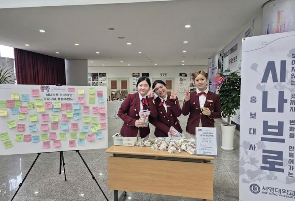 ○ 우리대학(총장 김정수) 홍보대사(시나브로)는 11월 27일(목) 기말고사를 앞두고 있는 재학생들을 응원하기 위하여 기말고사 응원 이벤트를 진행하였다. 홍보다사(시나브로) 13기는 시험 기간을 앞두고 지친 재학생들의 긴장을 덜어주고 힘을 북돋아 주고자 정성껏 준비한 간식을 전달하고, 서로에게 격려의 메시지를 남길 수 있는 응원 메시지 코너를 운영하며 캠퍼스에 활기를 더했다.