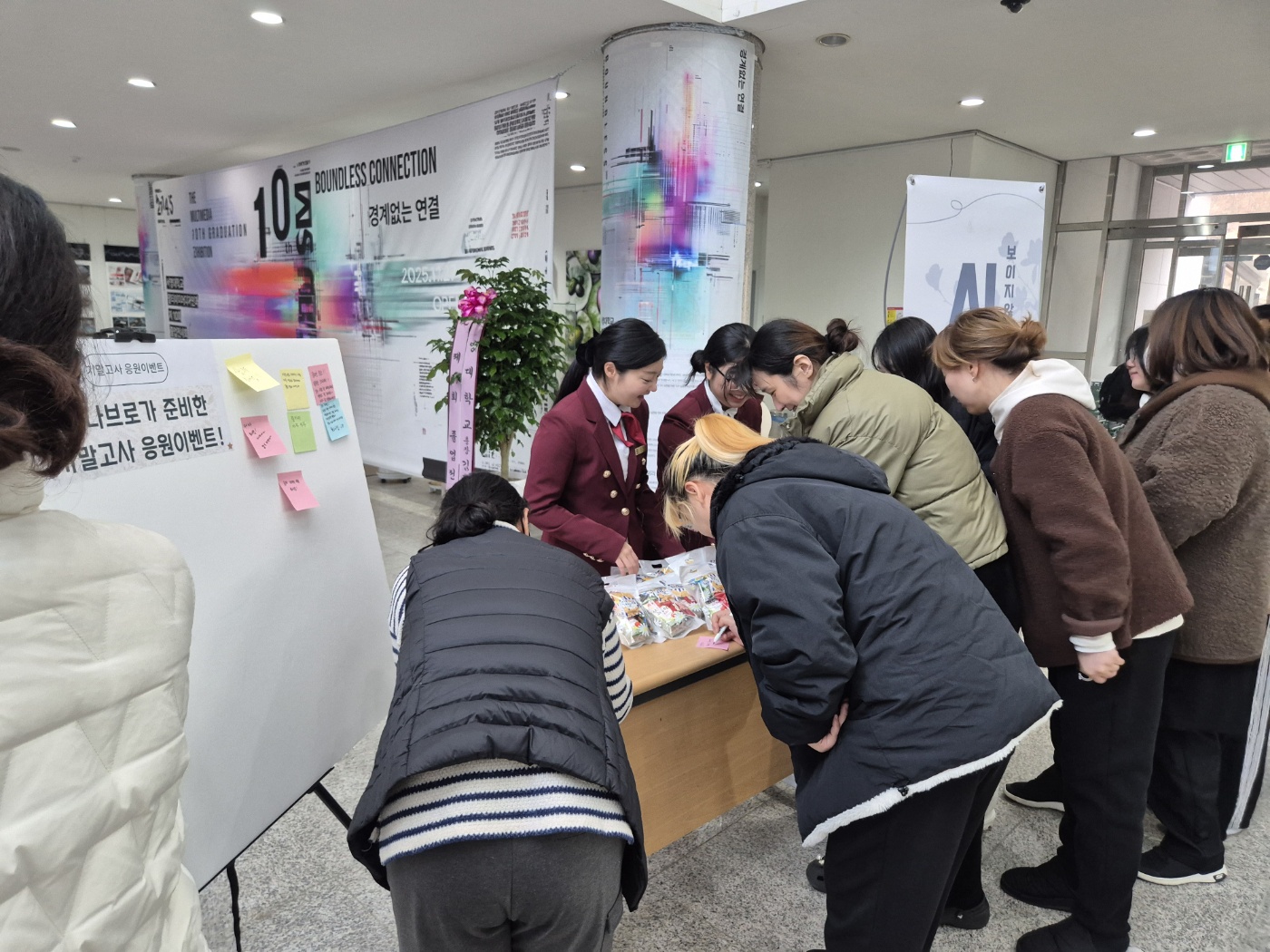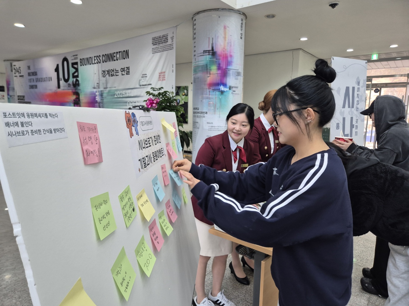 ○ 이번 행사에는 시작부터 많은 학생들이 관심을 보이며 참여하여 따뜻한 응원 분위기가 자연스럽게 이어졌다. 행사장 곳곳에는 웃음과 격려가 끊이지 않았으며, 학생들은 “힘이 난다”, “응원 덕분에 기말고사는 더 좋은 결과를 얻을 수 있을 것 같다.”고 말하는 등 높은 호응을 보였다.